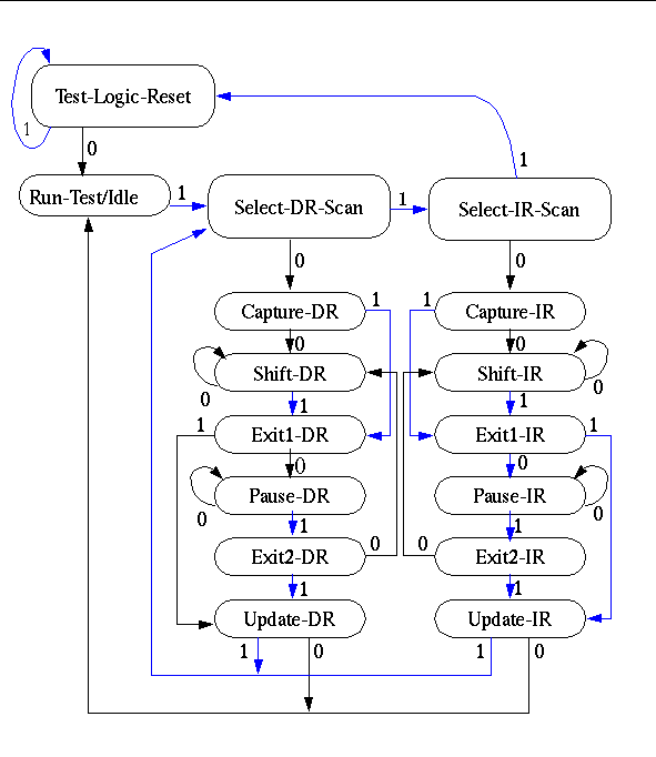 As one can see from the state machine, after the Capture-DR or Capture-IR state (which causes a parallel load of all the elements of the buckets of the shift register) you can do a series of Shift-DR or Shift-IR sequences to shift the caputred date out to TDO. Similarily you can via a series of shifts bring in a set of bits from TDI and then do a Update-DR or Update-IR (which causes a parallel load of all the outputs). Of course it is not quite this simple - as there is more than one data register and you have to use operations on the instruction register to selection on of the following data registers: