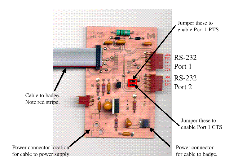 This board was designed by M. T. Smith to provide both two serial interfaces to the badge and to provide regulated 3V power to the badge.
